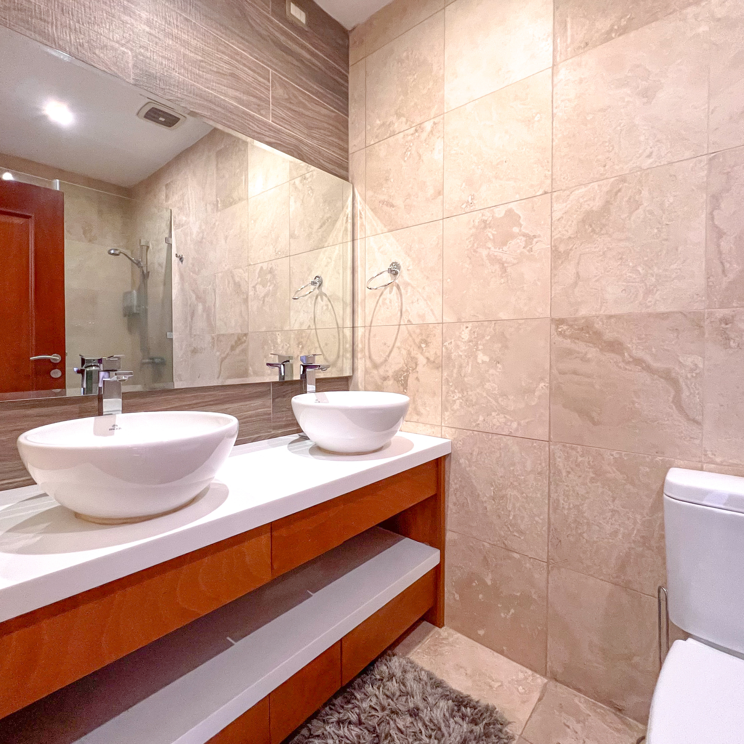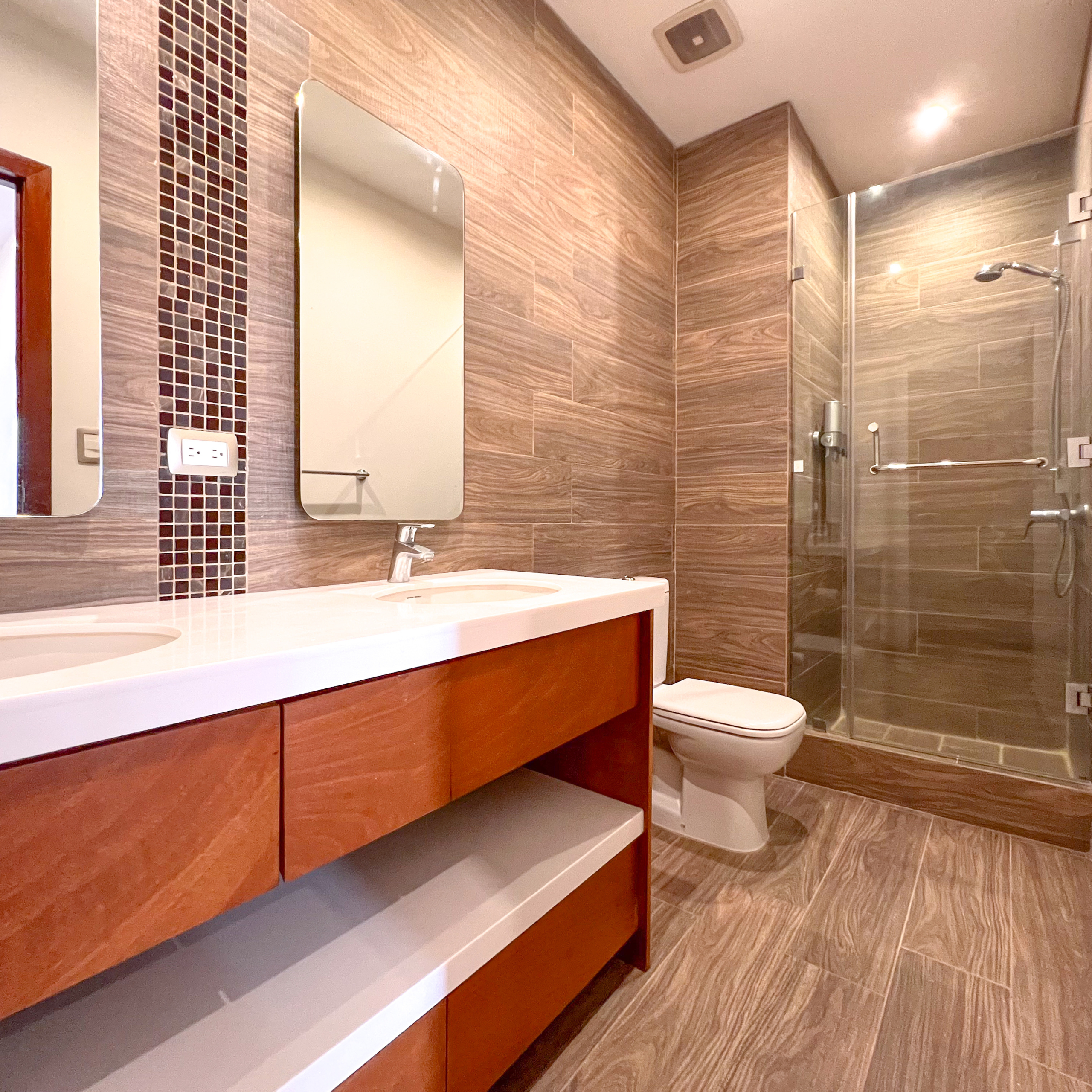 El apartamento cuenta con 2 dormitorios, cada uno con baño privado y closet, más un baño de visitas. La sala y comedor se integran con una cocina equipada y moderna, además de dos balcones que brindan iluminación natural y un ambiente fresco. Incluye área de lavandería equipada, bodega y 2 parqueos techados.